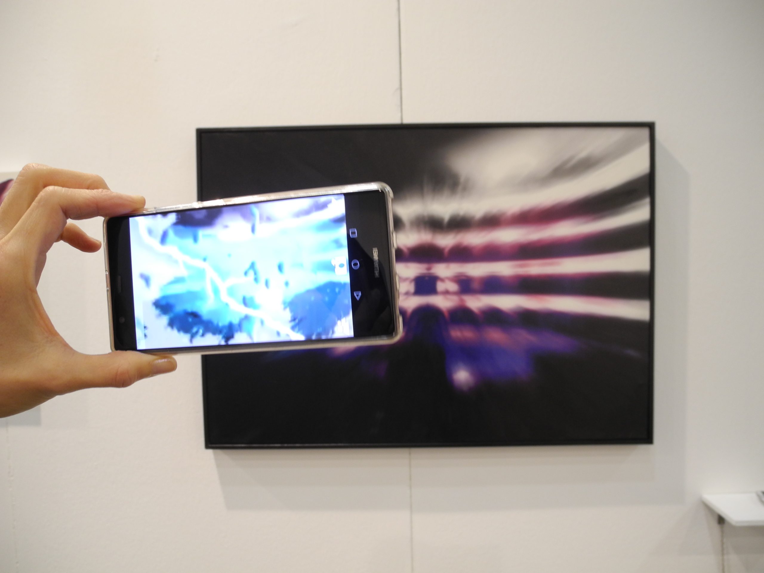 Passando a gallerie meno “famose”, mi piace segnalare Soave Arte di Alessandria (stand 16) con una bella scelta di opere di astrattisti italiani della prima metà del Novecento e bei lavori di Nouveaux Réalistes; Roberta Lietti di Como (60) con notevoli disegni di piccolo formato di Mario Radice e Carla Badiali; Eidos di Asti (18) ancora con Nouveaux Réalistes e due belle opere di Gianfranco Baruchello e Jiří Kolář, più una particolarissima opera interattiva di Aidan (n. 1979): Tra le righe (2016), un quadro che “innesca” un’animazione elettronica se osservato tramite smartphone; La Piazzetta di Udine (74) che presenta tra l’altro gli interessanti lavori di Bruno Beltramini, giovane direttore della fotografia e videomaker friulano (si tratta di riprese digitali su supporto iPad incorniciato come un quadro, con ipnotiche immagini della natura) e un bell’olio e inchiostro su carta a mano di Mauro Gentile (n. 1974): Atlas.