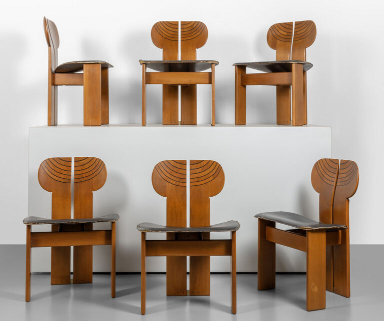 Tra i lotti più attesi spicca il lotto 2203: un set di sedie “Africa”, disegnate da Afra e Tobia Scarpa per la serie “Artona” di Maxalto. La preziosità del legno di noce, arricchito da intarsi in ebano e finiture d’ottone, si unisce alla rarità della presenza dei loghi originali della manifattura, rendendo il set un insieme raro sul mercato.