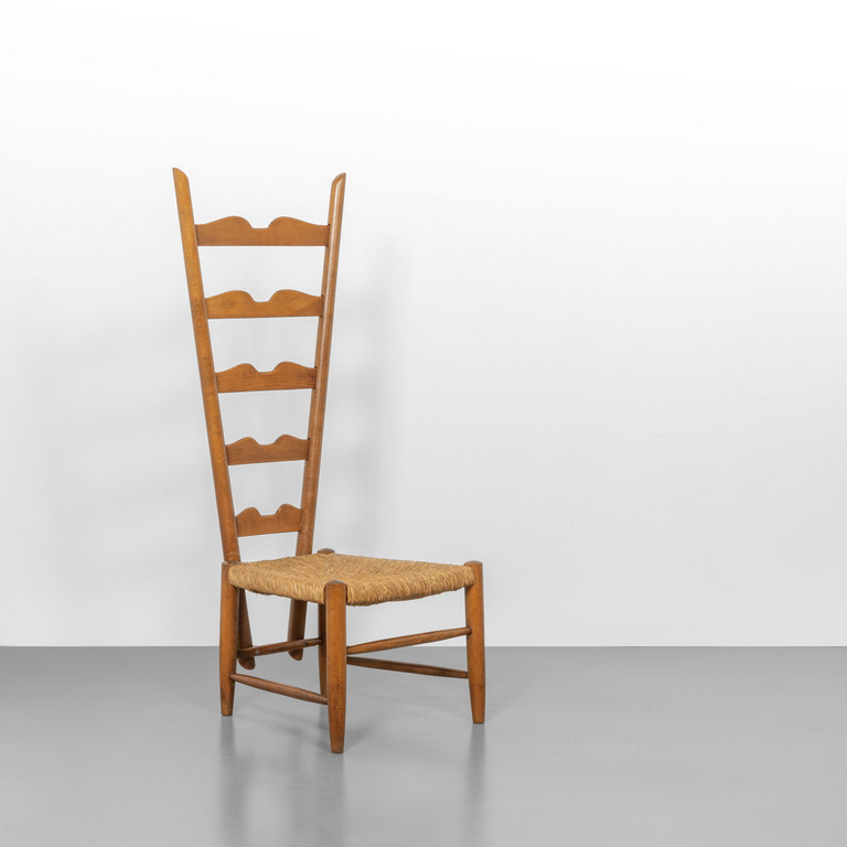 Altrettanto rilevante la “Sedia da Camino” (lotto 2026), in legno di faggio e paglia intrecciata, modello apparso sulla copertina della rivista “Stile” nel 1942. Il lotto rappresenta la sintesi perfetta tra leggerezza e linearità, offrendo a collezionisti un pezzo iconico della progettualità milanese.