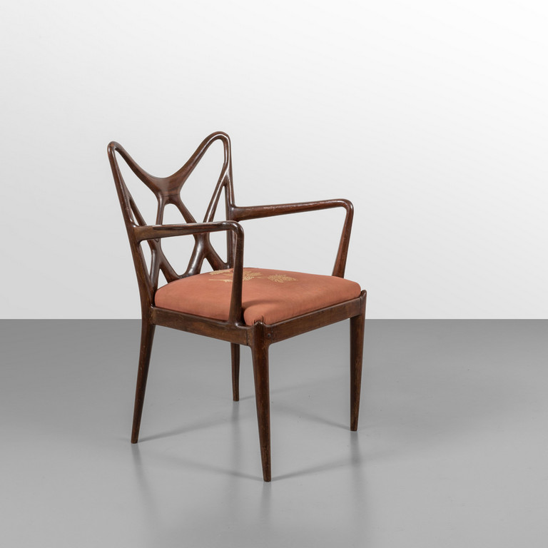 A guidare i top lots della prima giornata è anche l’eccezionale poltroncina da scrivania di Ico Parisi (lotto 2079), datata 1950. Realizzata in noce massello con seduta in pelle, l’opera rappresenta una rarità assoluta: si tratta del secondo esemplare conosciuto al mondo. La seduta testimonia quella delicata fase di transizione del design italiano dei primi anni ‘50, tra tradizione artigianale e apertura alla modernità.