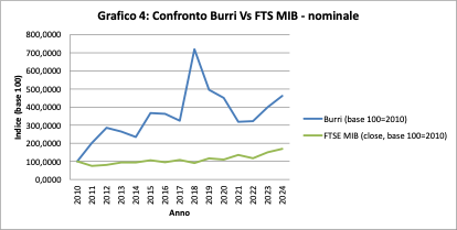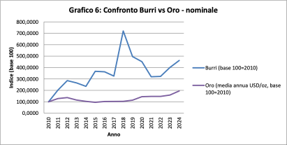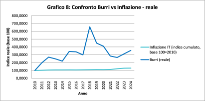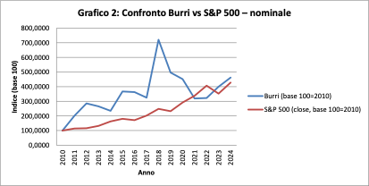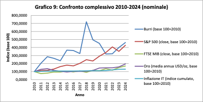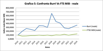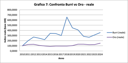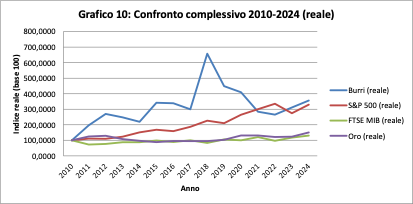 L’inflazione cumulata nel periodo porta l’indice a circa 130 nel 2024, mentre Burri si attesta a oltre 356. Il potere d’acquisto reale è più che triplicato rispetto al 2010. Dunque non si tratta solo di protezione ma, di accumulazione reale.