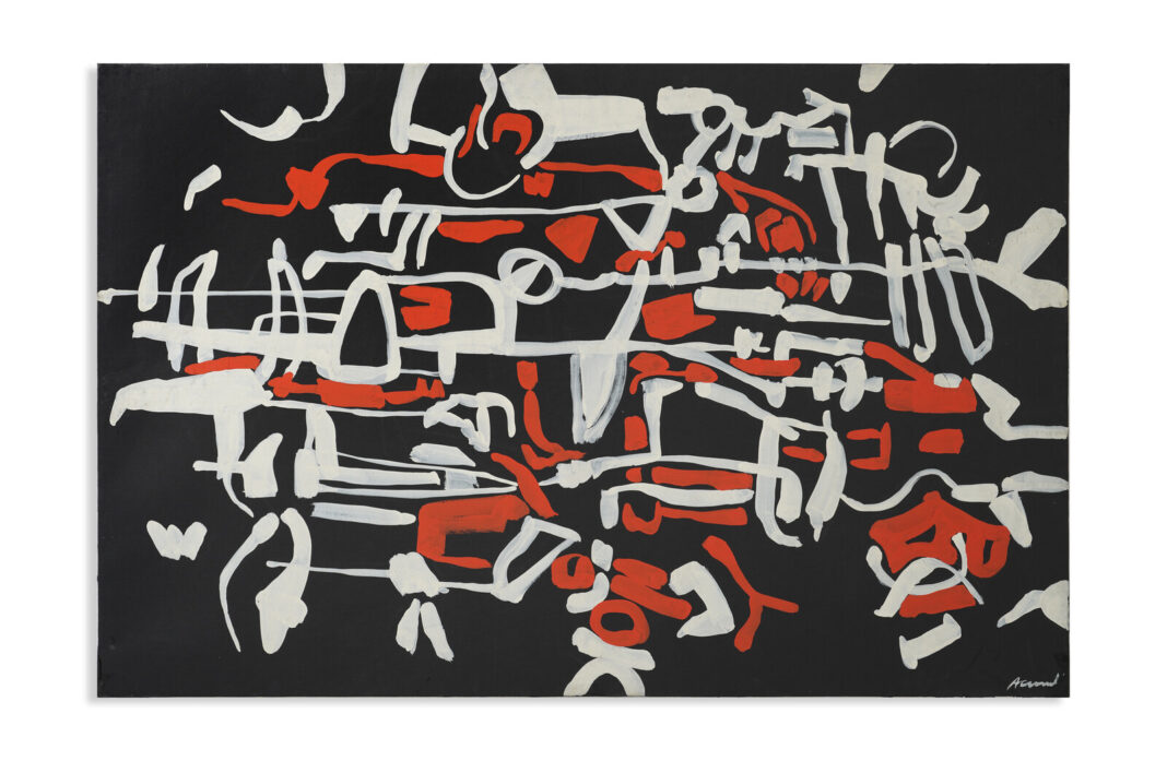 Cuore della vendita è il lotto 15, “Primo maggio a Mosca” di Giulio Turcato (stima €80.000–120.000), opera chiave dell’astrattismo italiano del dopoguerra. Presentata alla Biennale di Venezia del 1952, segna un passaggio fondamentale verso una pittura libera da vincoli figurativi, dove segno e colore si espandono in una dimensione dinamica e lirica.