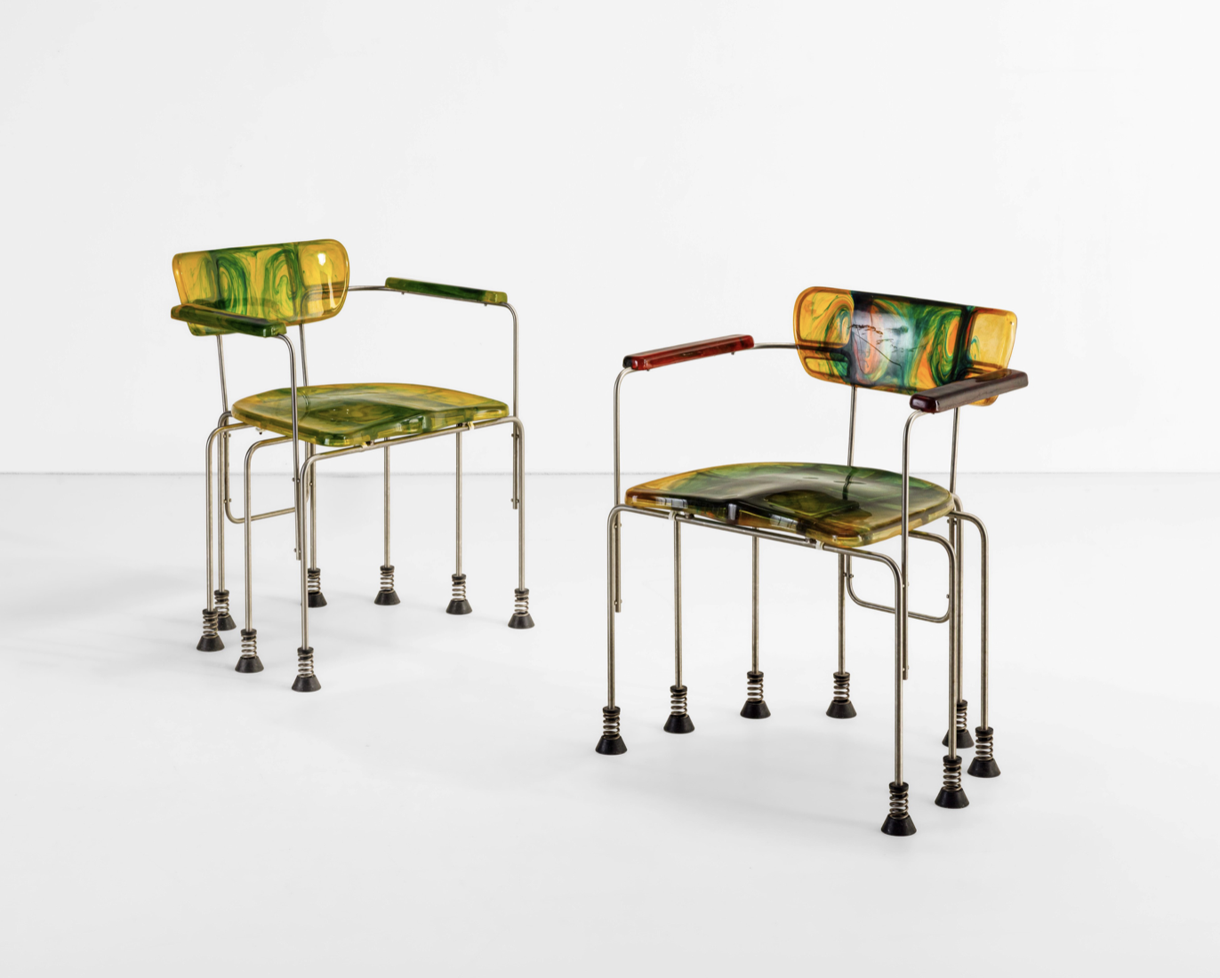 Non mancano elementi illuminotecnici di rilievo, come la lampada a plafone mod. 2448 (lotto 71) di Max Ingrand, esempio raffinato del design del vetro del dopoguerra (stima €800–1.000). Chiude la selezione il lotto 195 di Gaetano Pesce: due poltrone “544 Broadway”, opere che incarnano l’approccio sperimentale e anticonvenzionale dell’autore (stima €4.000–6.000).