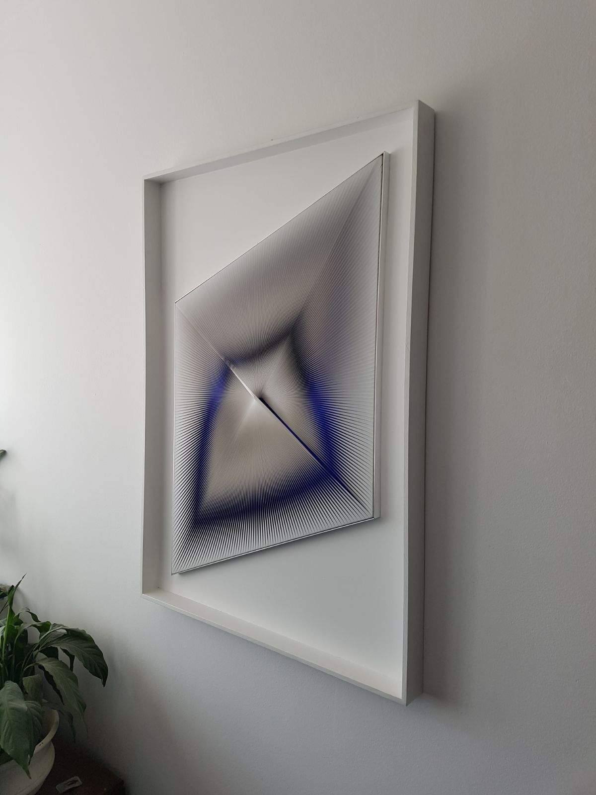 I.C.: «La mia vera “prima volta” è arrivata comunque dopo un po’ di anni e un bel po’ di sacrifici. Mi comprai un’opera di Getulio Alviani, alluminio su laminato blu. Non ci dormivo la notte, me la guardavo e riguardavo con i suoi effetti optical che la mettevano sempre in movimento. Quel geniaccio di Alviani mi fece innamorare dell’Arte Cinetica. Soprattutto mi dava una sensazione di serenità… non ho ancora capito bene il perché, ma il bello dell’arte contemporanea è anche questo: nasconde sempre qualcosa di misterioso».