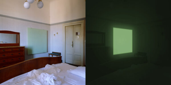 Il cuore della mostra è Opera per camera da letto: dedicato a chi dorme (1995), un lavoro ideato per un luogo preciso: la stanza 402 del Palace Hotel di Bologna. L’opera nasce nell’ambito del progetto “Territorio Italiano”, curato dallo stesso Di Pietrantonio negli anni Novanta. Si tratta di una tappa cruciale nel percorso di Garutti, un confronto tra intimità e spazio pubblico, tra materia e percezione. All’interno della camera d’albergo, l’artista colloca un cristallo dipinto sul retro con pittura fosforescente, visibile solo a chi vi trascorrerà la notte. L’opera si rivela così come un’esperienza segreta, quasi clandestina, che non si offre allo sguardo di tutti ma solo a chi, per caso o destino, capiterà in quella stanza.