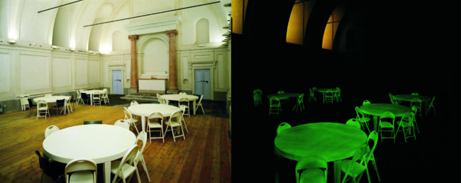 La mostra INCIPIT presenta anche due serie fondamentali nella ricerca di Garutti: Opera dedicata a chi ora alza gli occhi e guarda (2015–2016) e Che cosa succede nelle stanze quando le persone se ne vanno? (2001–2023). In entrambe la pittura fosforescente torna come linguaggio espressivo, simbolo al tempo stesso di luce e di assenza. Questa pittura investe oggetti di uso quotidiano, trasformandoli in tracce di una vita domestica e intima che continua a pulsare anche dopo il passaggio dell’essere umano. “ll pubblico non li vedrà se non come semplici oggetti d’arredo. Ho voluto modificare la percezione che il pubblico ha dell’opera: essa si può solo immaginare, pensare, aspettare. È in questa tensione immateriale che si svela il lavoro. L’opera si realizza solo nell’incontro con lo spettatore: a lui si chiede un paziente sforzo per cercarla.” (Alberto Garutti in un’intervista con Hans Ulrich Obrist, in “Domus”, n. 901, marzo 2007)