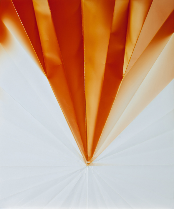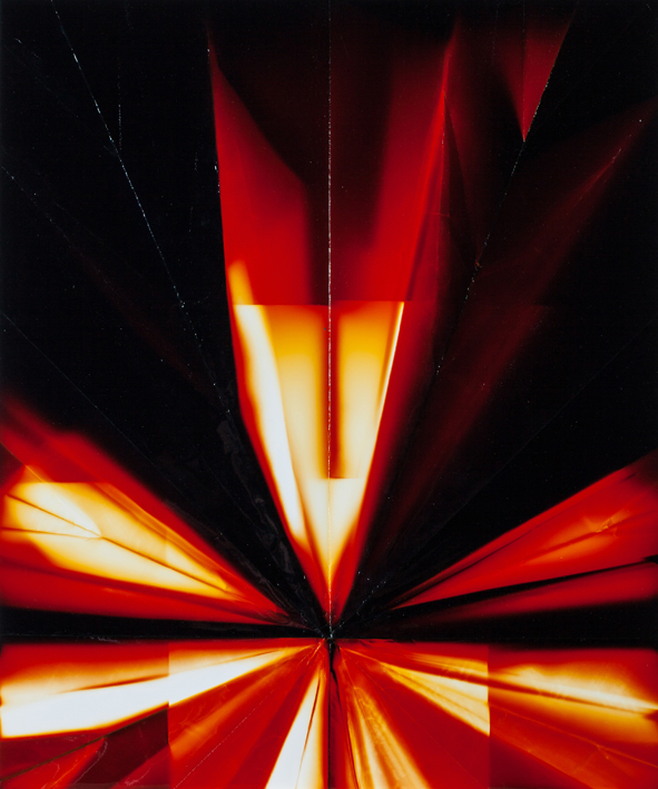 E.C.: «Nel lavoro 60 Watt-18, 97 Feet cerco di raccontare lo spazio dello studio attraverso fogli di carta fotografica, piegati al buio nella forma di aeroplanini e lasciati volare con la luce accesa all’interno dello spazio. Il risultato, una volta sviluppati, sono geometrie coloratissime, sulle quali resta impressa la velocità della luce. Il titolo 60 Watt-18, 97 Feet fa riferimento alla lunghezza della stanza e all’intensità della luce. Untitled (Explosion), invece, è uno dei primi lavori in cui mi sono servito della carta fotosensibile; è stato la conseguenza di un’altra serie di opere intitolate Explosion (2009) in cui, come in una sorta di test, ho registrato su blocchi di cera la deflagrazione di piccoli esplosivi, dove il gesso, una volta colato nella cavità, restituiva la forma esatta dell’esplosione. Il bisogno successivo è stato quello di registrare la luce, da qui la serie fotografica in camera oscura. Vedo questi lavori come vere e proprie sculture. Un modo per dare immagine e corpo all’energia».
