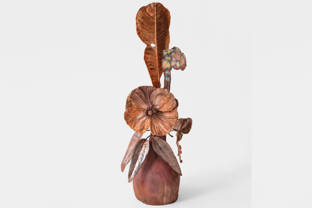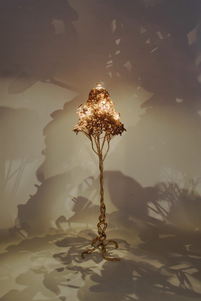 Il percorso espositivo si snoda tra opere di scala monumentale e micro-sculture indossabili. Spiccano lavori come La Géante (2024), un papavero dalle dimensioni architettoniche che sfida la gravità del metallo con la leggerezza della sua forma originaria, e Aqua (2024), un lampadario dove la natura elettroformata diventa struttura luminosa. La serie Still Lifee opere come Bloom e Volcano confermano la capacità dell’artista di elevare l’oggetto vegetale a forma autonoma, capace di dialogare con lo spazio espositivo di una casa d’aste storica.