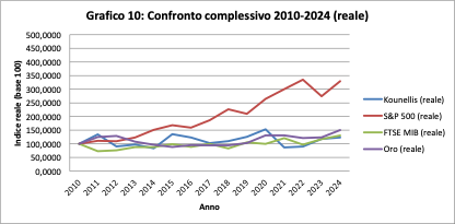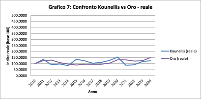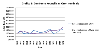 L’oro cresce in modo progressivo, arrivando nel 2024 a circa 195 nominale. Kounellis resta al di sotto, fermandosi a circa 160.
