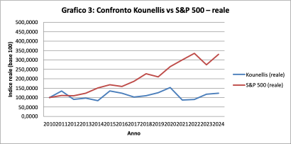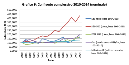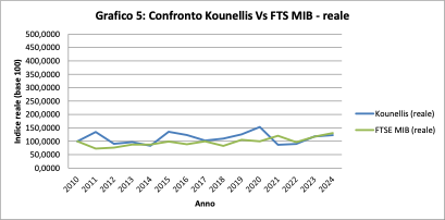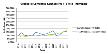 Il confronto con il FTSE MIB è più equilibrato. L’indice italiano cresce lentamente, arrivando nel 2024 a circa 169 nominale. Kounellis si colloca poco al di sotto, a circa 160.