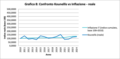Questo significa che, nel lungo periodo, Kounellis mantiene quasi integralmente il potere d’acquisto, ma senza generare una crescita reale significativa.