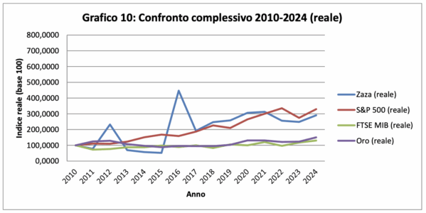 La curva di Zaza è poco volatile e sale con pazienza: da 100 nel 2010 a 376,5 nel 2024 (nominale). Depurata dall’inflazione, arriva a 290,3. La fase iniziale è più movimentata, com’è naturale nei mercati poco liquidi; dal 2017 l’andamento diventa molto più regolare, con una traiettoria di crescita complessiva nonostante qualche lieve flessione intermedia.