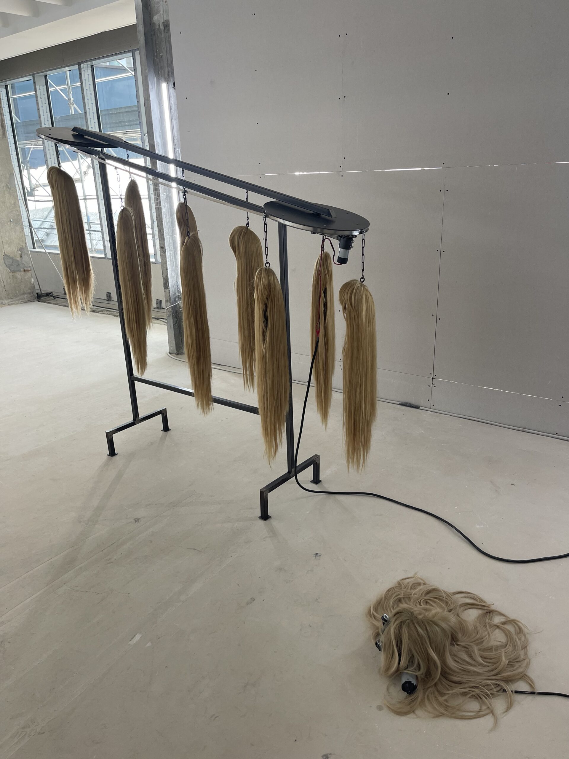 La Galleria Vistamare presenta un altro progetto ben definito, quello di Anna Franceschini, “Villa Straylight” (2019). L’installazione utilizza elementi meccanici (una sorta di binario come nastro trasportatore) da cui pendono lunghe parrucche bionde creando un movimento coreografico e artificiale. C’è un riferimento letterario preciso: il titolo e l’atmosfera si ispirano a Neuromancer, il celebre romanzo cyberpunk di William Gibson. Villa Straylight è, nel libro, una dimora labirintica e decadente situata nello spazio. La ricerca della Franceschini si concentra sul dare movimento agli oggetti, in questo caso trasforma elementi ornamentali (le parrucche) in frammenti di una macchina, esplorando il confine tra umano e artificiale, tra ciò che è animato e ciò che è un semplice oggetto, riflettendo sulla coesistenza instabile tra corpi e macchine, mirando a creare un ambiente disorientante che invita lo spettatore a confrontarsi con concetti come l’artificio, l’impermanenza e la trasformazione della materia, evocando un futuro in cui l’identità umana e la merce si fondono, perdendo i loro confini definiti.