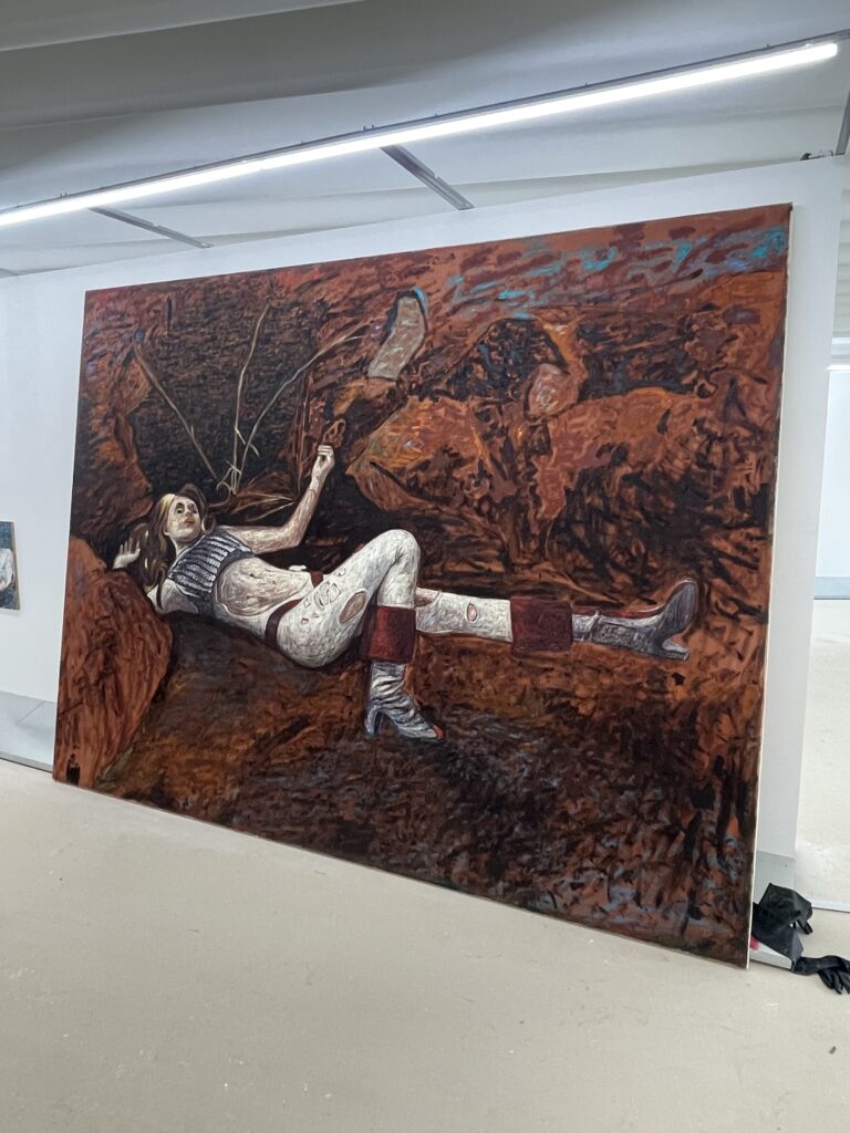 La maestria pittorica è raccontata anche da Ermes Ermes che porta Andrea Salvino: le pennellate sono morbide ma precise, le tonalità terrose e talvolta desaturate, ai soggetti è spesso conferita un’aura da “ritrovamento archeologico” utilizzando un’estetica che richiama il realismo ma filtrato da una patina malinconica e cinematografica; Salvino infatti s’ispira a vecchie fotografie, fotogrammi di film (spesso del cinema politico anni ’70 o del neorealismo) e archivi storici, esplorando utopie fallite, momenti di resistenza, figure di anarchici o intellettuali dimenticati.