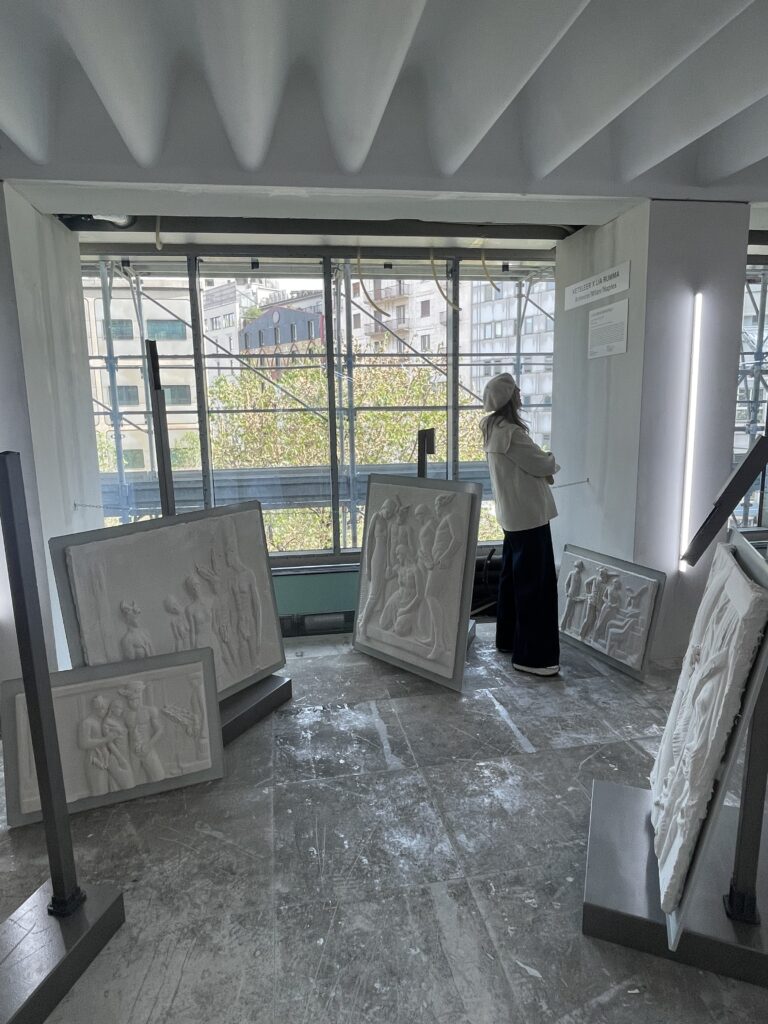 L’unione delle forze tra Keteleer + Lia Rumma è una delle operazioni più riuscite per il solo show di Luca Monterastelli. Le sue sculture indagano la propaganda e la stasi dell’architettura: “La Tempesta” (2026) è una serie di pannelli in gesso a rilievo variabile che reinterpretano il bassorilievo come strumento narrativo urbano: il progetto esplora temi di potere e sottomissione, utilizzando elementi ispirati all’architettura e al design funzionale. L’artista interviene su simboli di autorità, trasformandoli: i corpi rappresentati diventano il luogo in cui il potere si manifesta e viene messo in discussione. Le superfici mostrano segni gestuali che alterano la leggibilità delle immagini, indebolendo la funzione celebrativa tradizionale del bassorilievo. In questo modo, l’opera perde il suo ruolo monumentale e si presenta come una sorta di “resto” o testimonianza di un’autorità ormai compromessa.