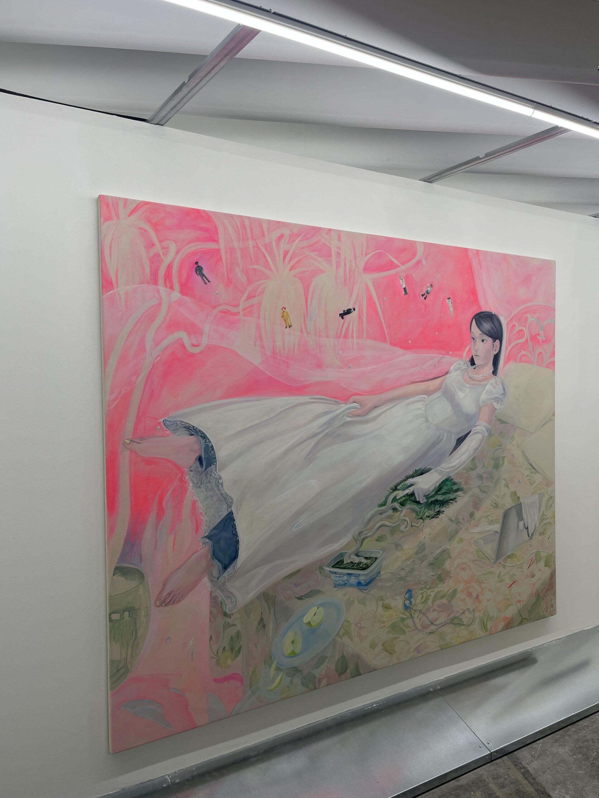 La più bella pittura è senza dubbio quella del giovane talento Ibuki Inoue, che da Ciaccia Levi fonde l’immaginario pop e kawaii tipico della cultura visiva giapponese contemporanea con una stesura pittorica onirica, si è pervasi da un senso di distorsione e fluidità, le figure sono immerse in una narrazione che mescola intimità e straniamento, tipico del suo linguaggio che indaga la saturazione dei desideri e del consumo. Inoue utilizza la pittura ad olio per dare una profondità quasi carnale a soggetti che, in mano a un altro artista, risulterebbero piatti o puramente grafici. Mentre i suoi lavori precedenti erano noti per l’uso ossessivo di sticker e per le sculture che richiamavano giocattoli deformati, a Milano Inoue dimostra una maturità pittorica sorprendente, trasformando il caos dell’estetica urbana e digitale in composizioni strutturate e avvolgenti.