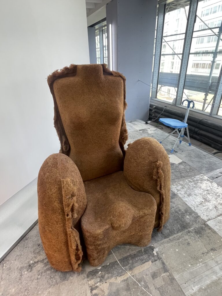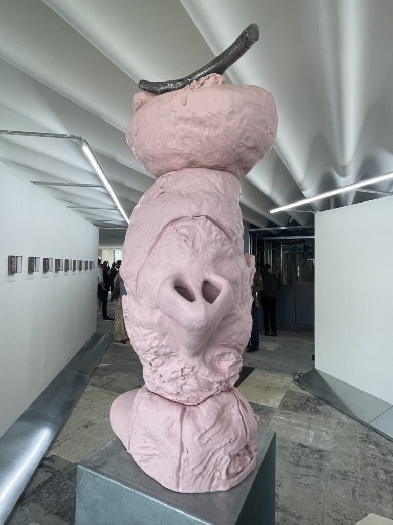 Il dialogo generazionale: da Luisa Delle Piane il fantasma geniale di Gaetano Pesce dialoga con le ossessioni materiche di Giovanni De Francesco. Il cortocircuito è generazionale e l’assonanza è materica. Il testamento estetico di Gaetano Pesce, scomparso ma più presente che mai, s’incontra con l’indagine plastica di De Francesco. Si guardi alla seduta monumentale che domina: una massa organica che pare ribollire sotto la luce zenitale del palazzo. Accanto i lavori di De Francesco rispondono con la densità del gesso e pigmento rosa, un assemblaggio di escrescenze scultoree che mimano il biologico senza mai citarlo direttamente, o meglio, ribaltandone l’ordine. Una riflessione sulla vulnerabilità dell’oggetto e del soggetto.