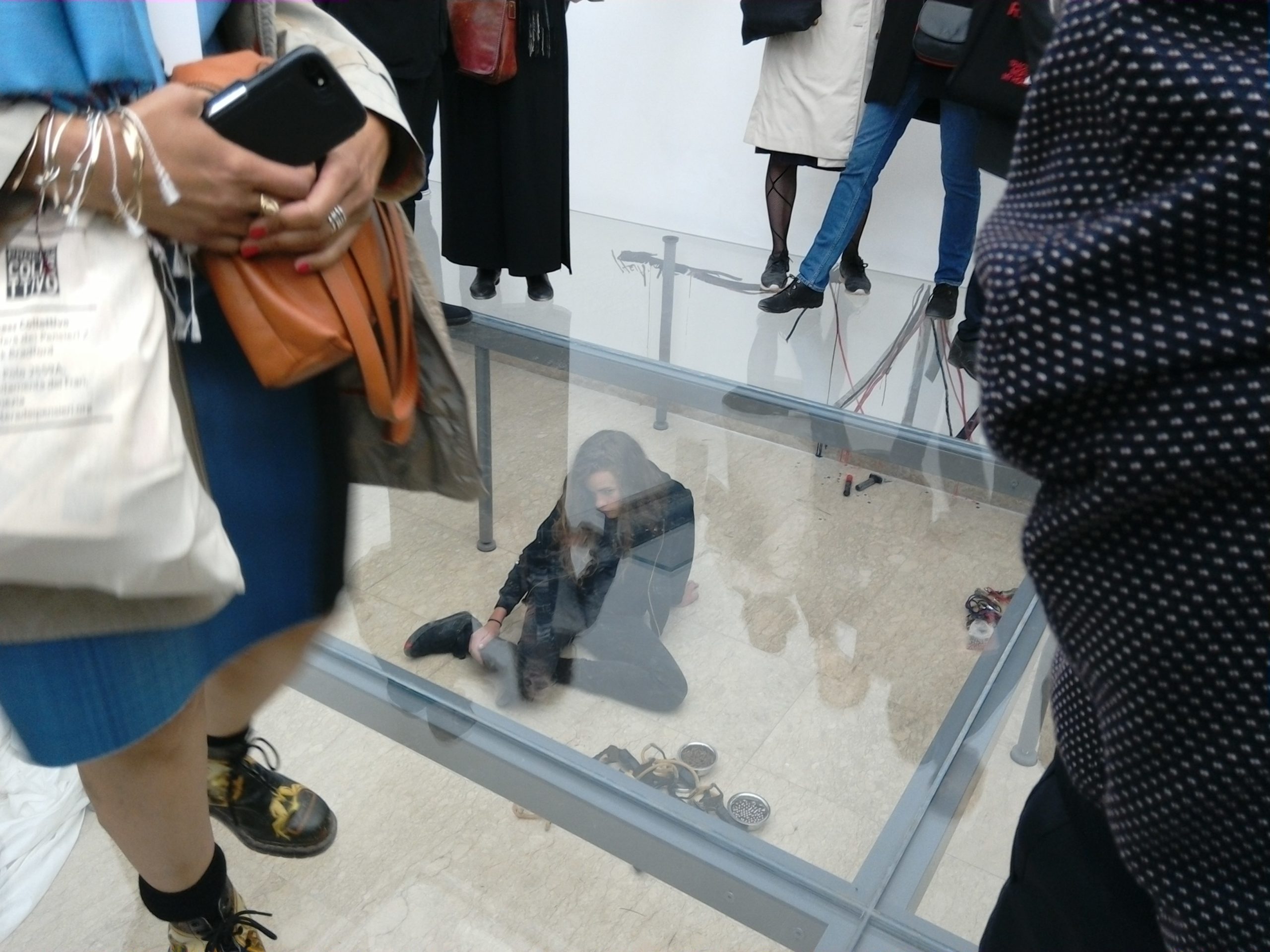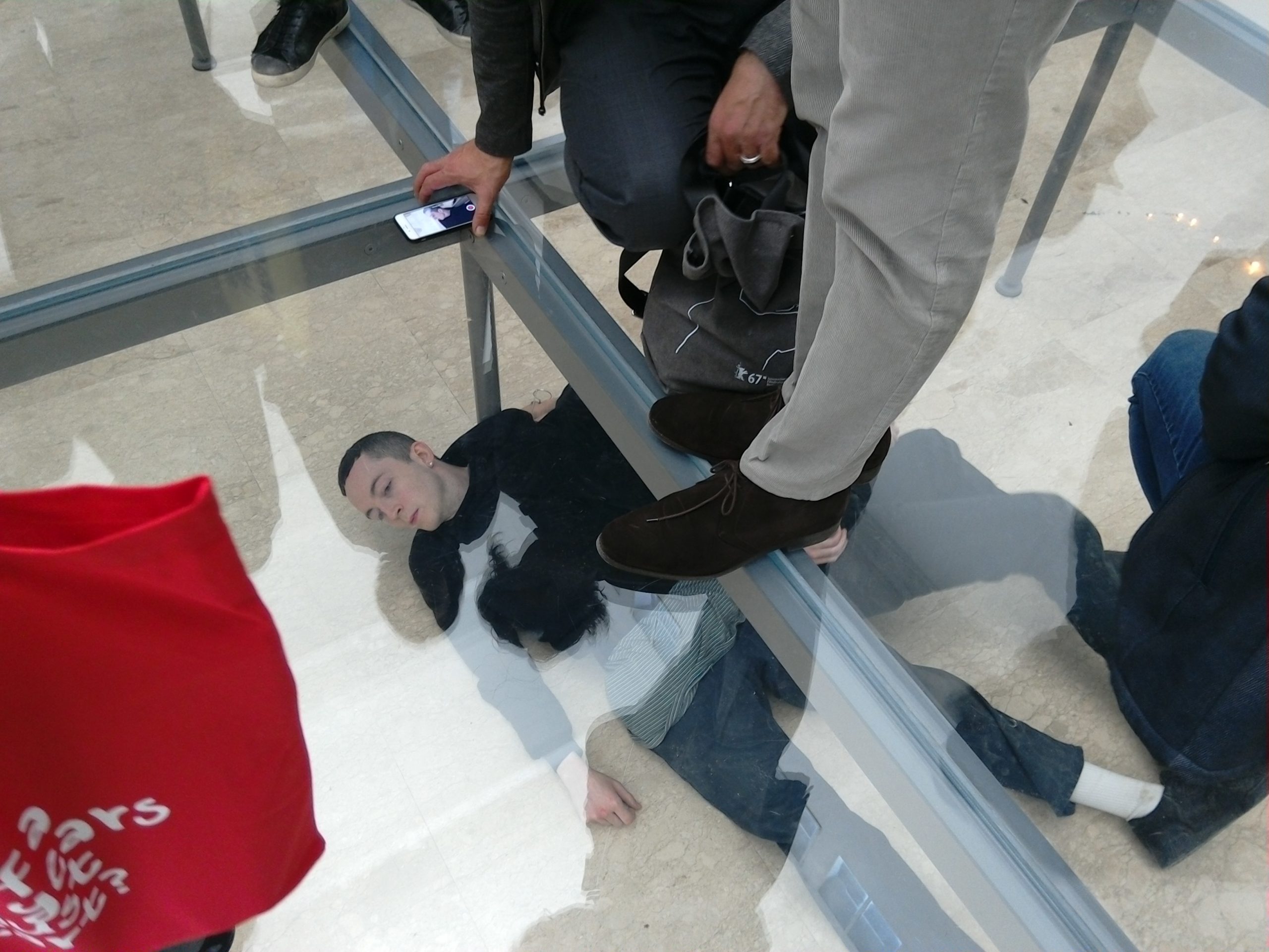 Usciti dal padiglione del Giappone ecco quello della Germania con, ad accogliervi, due doberman messi lì di guardia dientro il recito che circonda il padiglione. E’ la prima parte del progetto che Anne Imhof ha realizzato per la partecipazione tedesca alla 57. Biennale. Un progetto inedito in cui la dimensione performativa si mescola con quella scultorea e pittorica; il tutto ritmato dai movimenti della coreografia che regola l’opera e che segue tutto il padiglione. Un lavoro che coinvolge immediatamente. L’ambientazione sembra quella di un centro finanziario, che tutto controlla e dove tutto è controllato, ma allo stesso tempo è anche un mondo “virtuale” fatto di vessazioni o semplice voyerismo. Con lo sguardo vi troverete a seguire quei corpi che si muovono sotto il pavimento di cristallo. E il senso di questo lavoro potentissimo vi apparirà chiaro nella mente… non aggiungo altro, perché è in questa epifania che sta tutto l’effetto sconvolgente di Faust. Un unico consiglio: lasciatevi coinvolgere.