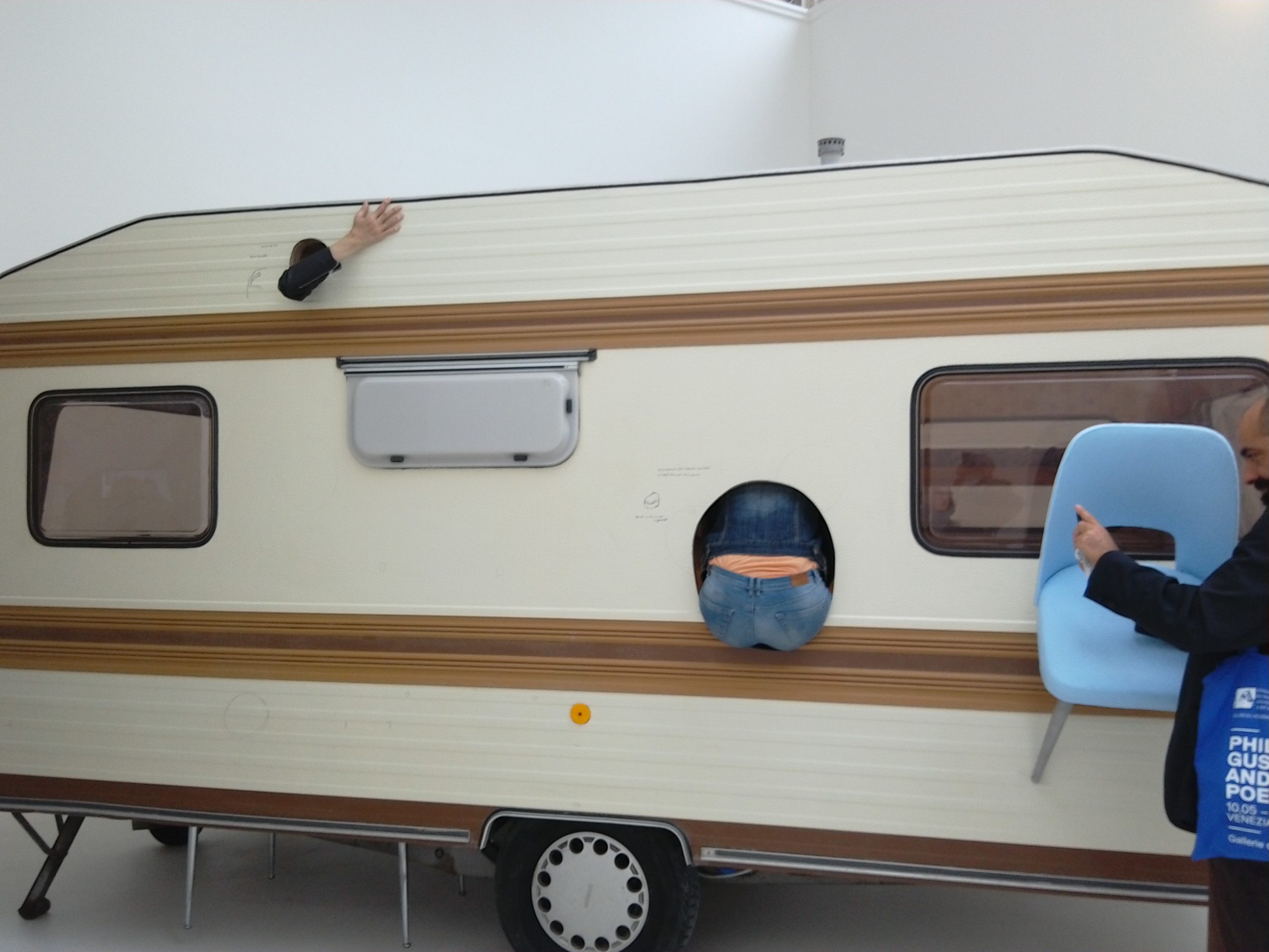 Il contributo di Erwin Wurm per il padiglione austriaco è decisamente particolare e pone l’accento su come sia mutata l’esperienza spaziale della scultura nel tempo. Dall’arte classica all’opeca delle macchine e dei media. Il risultato è un’arte spaziale vera e propria in cui lo spettatore è chiamato ad esprire direttamente le condizioni di mobilità e immobilità che sengnano il passo tra un prima e un dopo in sculturae, più in generale l nostro modo di vivere lo spazio. Nascono così le sua One Minute Sculpture, sculture comportamentali dove i visitatori devo seguire specifiche istruzioni per “viverle” ed esserne partecipi. Il tutto documentato con scatti fotografici, guidandoci verso una triplice esperienza spaziale: corporea, meccanica e mediale. In altre parole lo “spazio” nell’epoca dei selfie e dei sistemi di messaggistica istantanea, in cui la distanza si riduce, ammiriamo eventi a cui non siamo presenti e lo spazio, quello che ci circonda, appare come lacerato, bucherellato, in bilico tra barrera limitante e ambiente illimitato.