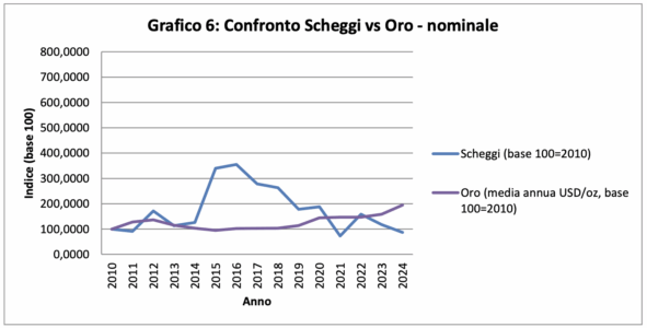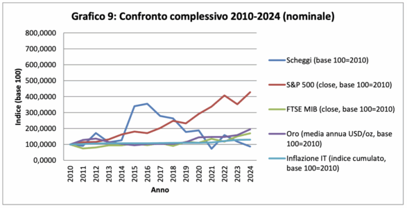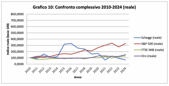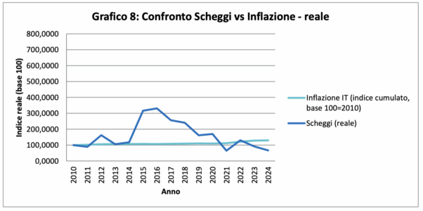 Questo dato è molto importante, perché permette una valutazione “minima” del rendimento reale: considerato l’intero periodo 2010–2024, Scheggi non mantiene in modo costante il potere d’acquisto reale.