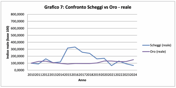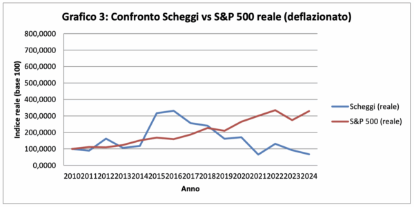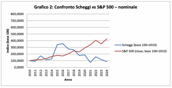 Nel grafico reale — quello depurato dall’inflazione — la differenza è ancora più evidente: l’indice americano supera i 300 punti negli ultimi anni, mentre Scheggi torna vicino ai livelli iniziali.
