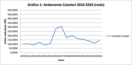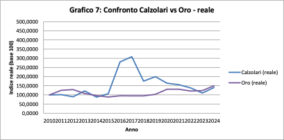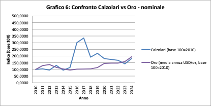 L’oro cresce in modo più regolare, senza picchi improvvisi. Calzolari, al contrario, presenta una dinamica ciclica: una fase espansiva intensa seguita da un rientro. Nel 2024, i due valori nominali finiscono per avvicinarsi.