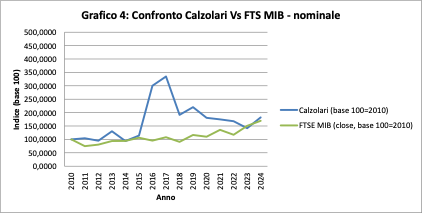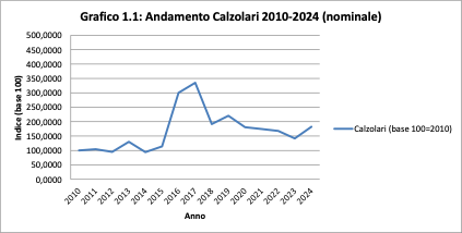 L’osservazione dell’andamento nominale conferma la lettura precedente. Anche qui il picco del 2016–2017 è evidente, così come il successivo ridimensionamento. Tuttavia, il livello di chiusura del 2024 resta nettamente superiore alla base 2010.