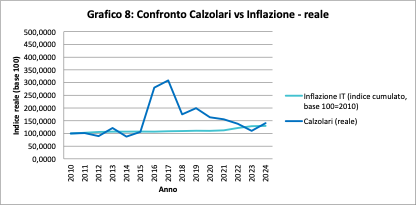 Il confronto con l’inflazione è il più diretto. L’indice dei prezzi cresce lentamente ma in modo regolare. Calzolari oscilla, sale e scende, ma nel 2024 (e non solo) il suo indice reale si colloca al di sopra della curva inflattiva (140.45 contro i 182,17 dell’indice “Calzolari nominale”). In generale questo significa che, nonostante la volatilità, il mercato di Calzolari ha preservato e leggermente accresciuto il potere d’acquisto nel periodo 2010–2024.