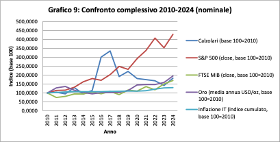 Lo S&P 500 domina per rendimento, l’oro cresce con regolarità, il FTSE MIB resta indietro, l’inflazione avanza lentamente. Calzolari si colloca in una posizione intermedia: non il più performante, ma nemmeno il più debole.