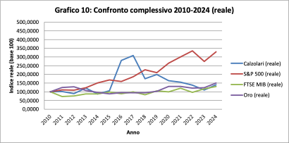 Analizzare Calzolari significa rinunciare all’idea di crescita lineare e accettare una logica diversa: quella dei cicli. I dati 2010–2024, normalizzati con base 100 nel 2010, permettono di leggere con chiarezza questa traiettoria, soprattutto se messi in relazione con alcuni benchmark esterni: mercati finanziari, oro e inflazione.